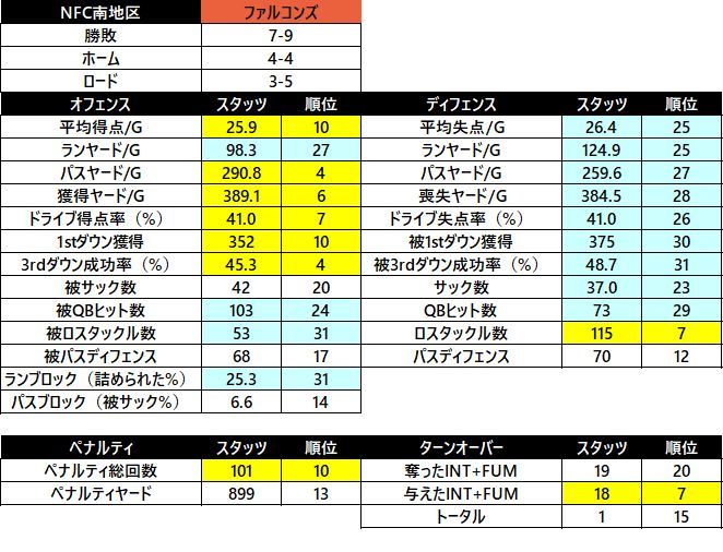 攻撃もRBコールマンの離脱でラン攻撃がうまく行かず、得点力は悪くはないですが、例年のファルコンズと比べると物足りない攻撃だったなぁと感じます。サック QBヒットのスタッツの通りOLがうまく行ってないのが攻撃に響いたのでしょうね。