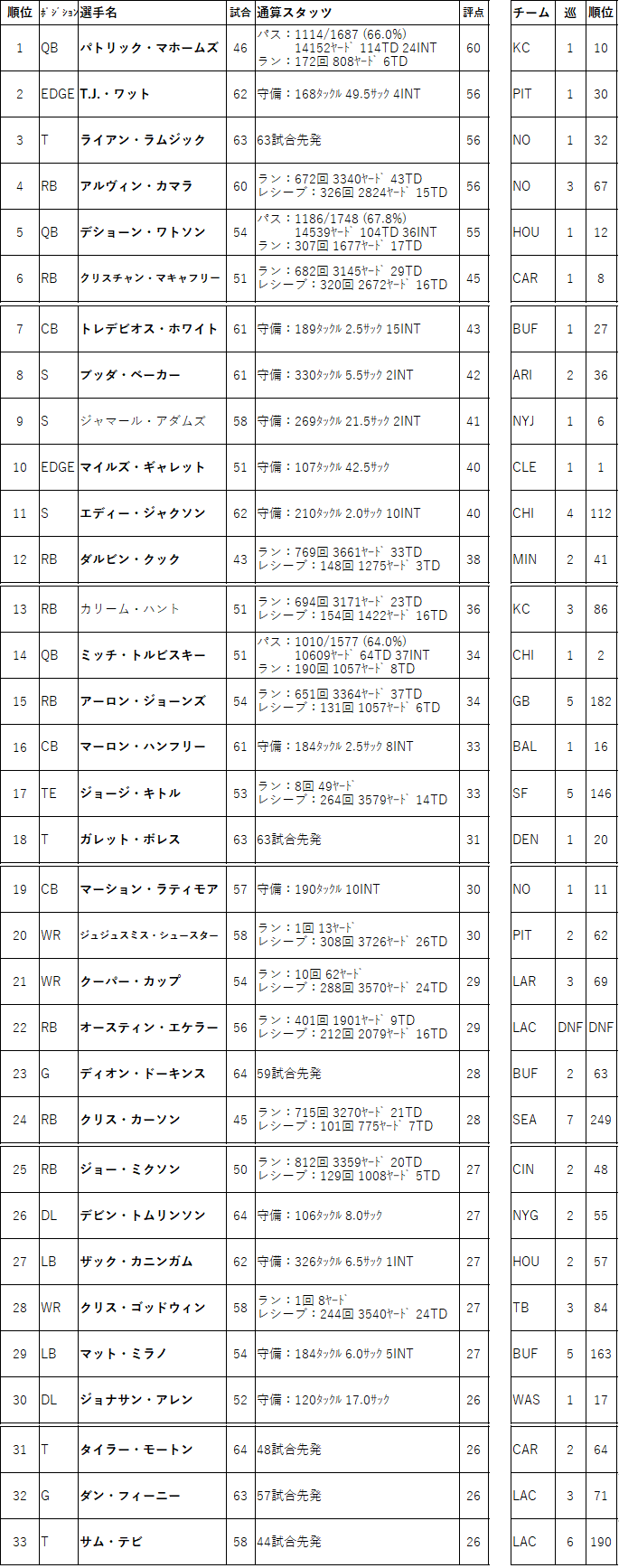ということでダントツでセインツが優勝となりました。プロボウル3人+フランチャイズ指定ですもんね。当然の結果と言えるでしょう。