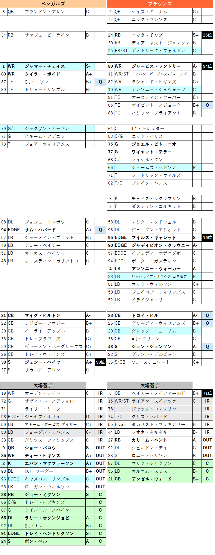 ããã©ãŠã³ãºãäžèšã®éãQBãã€ã«ãŒã»ã¡ã€ãã£ãŒã«ããæªæäººãªã¹ãå ¥ããæ¬ å ŽãCOVID-19ã«ããCBãã³ãŒã«ã»ãŠã©ãŒããæ¬ å ŽãšãªããŸããããšããããæçµæŠãªã®ã§ç¡äºã«çµããã ãã§ããã