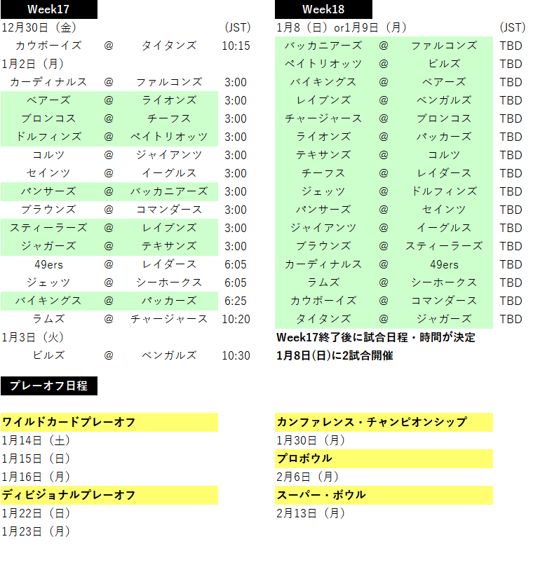 æçµé±ãšãªãWeek18ã¯å šè©Šååå°åºå¯Ÿæ±ºãšãªããŸãããã¬ãã·ãã«ã¹ã±ãžã¥ãŒã«ã§Week17ãçµãã£ãåŸã«æ¥çšã»è©Šåæéãæ±ºãŸãã1æ8æ¥ã«2詊åã9æ¥ã«14詊åè¡ãããŸãã
