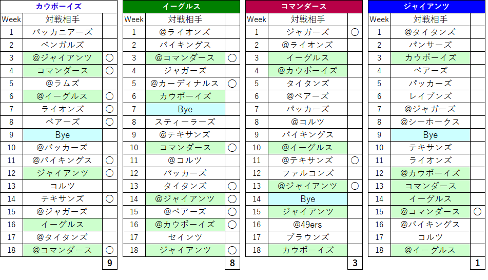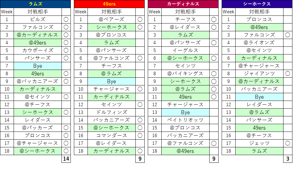 | SF 49ers | 9 | 8 | 6 |