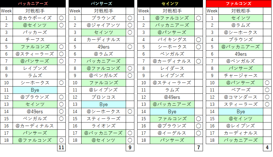 ããã¡ã«ã³ã³ãºã¯4åãšèŠããã·ãŒãºã³ã«ãªãããªãšæããŸããæ£çŽåå°åºã§ã¯æŠåçã«ã¯å³ãç®ãšèšããããåŸãŸãããQBããŒã«ã¹ã»ããªãªã¿ã¯å¥œããªQBãªã®ã§å¿æŽããŠãããå çºã«åå®çããŠã»ããã®ã§ãããçŸå®çã«ã¯å³ããããªãšäºæ³ããŸãããã¡ãã¯èŽå±ç®ãªãã®ã¬ãäºæ³ãšãªã£ãŠããŸãã