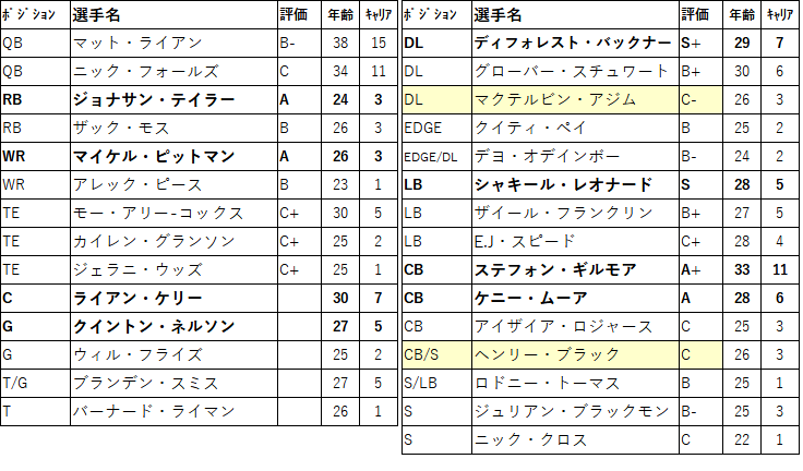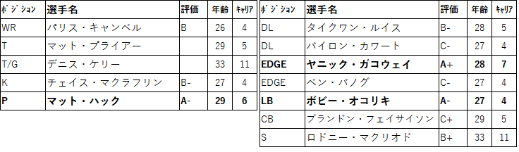 あとはデッドマネーは少ないが解雇はしにくい選手達と契約見直しでキャップを確保したいところです。正直なところ現状でもお買い得なメンバーな気もするので契約見直しでも来年度以降のキャップには影響は出そうではあります。