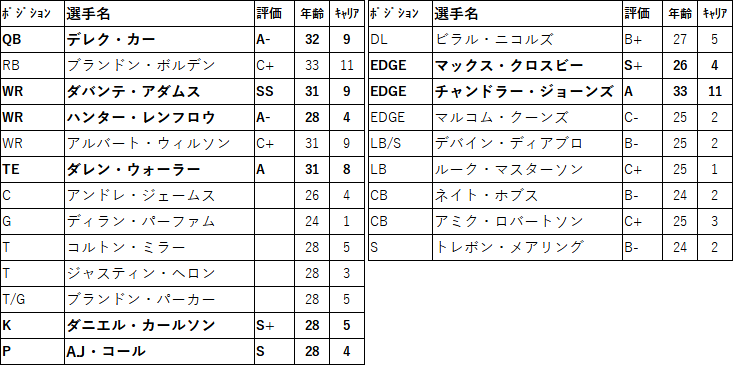 すでにQBデレク・カーが分かれを告げていることもあり、QB補強を模索しなければならなくなった。カー以上の選手を見つけるのは難しいですし、ドラフト指名しつつブリッジQBを補強することも考えないといけないかもしれません。