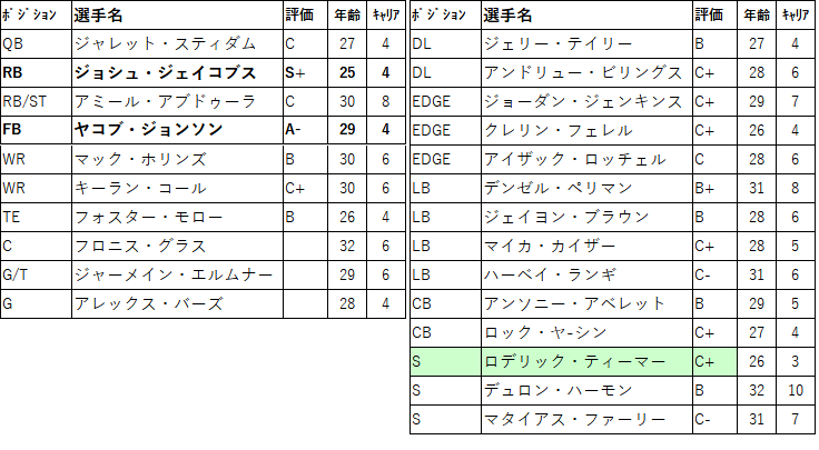 今シーズンのリーディングラッシャーRBジョシュ・ジェイコブスはフランチャイズ指定をしてでも残留させないといけません。指定後でもいいので大型契約も考えたい選手です。