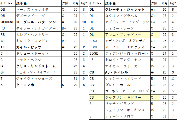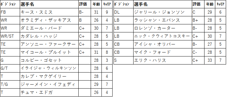 レシーバーも少ないのでWRオラミディ・ザッキアスもできれば残したいところです。なかなか放出したくない選手が多めな今オフですね。