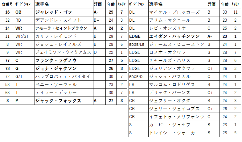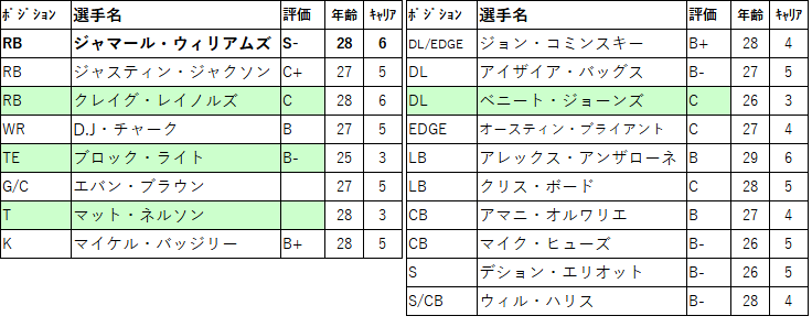 RBジャマール・ウィリアムスはチームのTDラン記録を更新するなどリーグを代表するRBに成長を遂げました。抜けると戦力ダウンは必至なのでなんとか残留させたい。フランチャイズ指定も考えるべき選手でしょう。