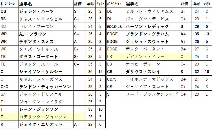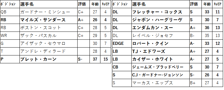 攻撃はエースRBマイルズ・サンダースがFAとなります。攻撃の軸となっている選手なので引き止められるなら引き止めたい。先発Gアイザック・セウマロもFAなのは痛いところです。