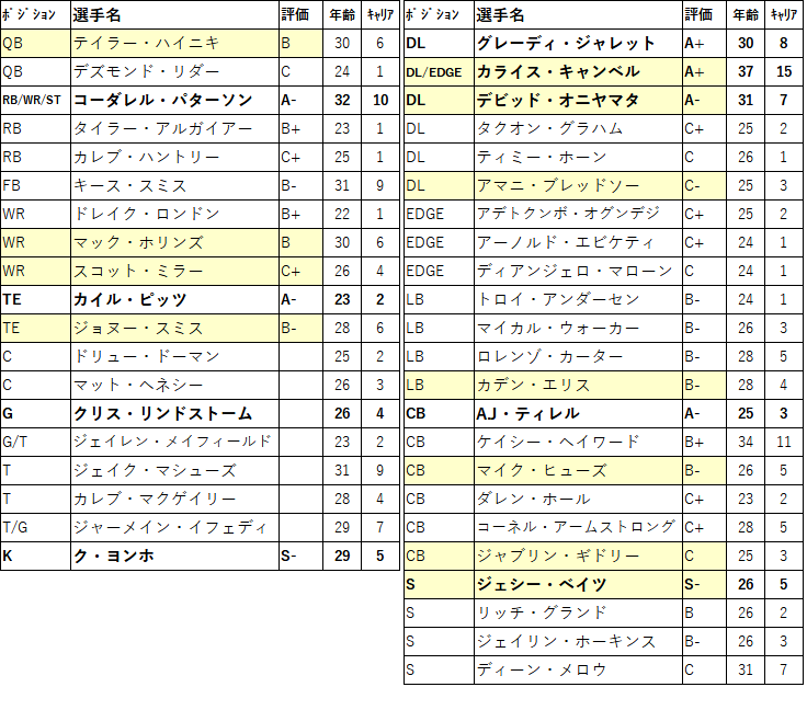 DB陣はFAでSジェシー・ベイツを獲得したのでCBを整備してパス守備を強化したい。