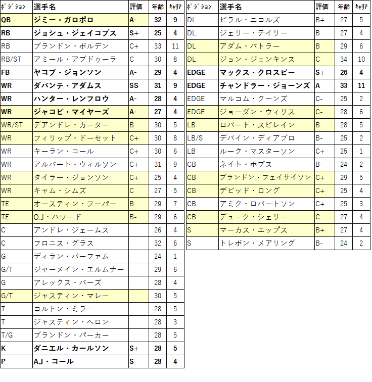 リーディングラッシャーとなったRBジョシュ・ジェイコブスをフランチャイズ指定し残留させました。ただ2番手以降が不安があり下位指名で2番手候補をしっかり指名しておきたい。