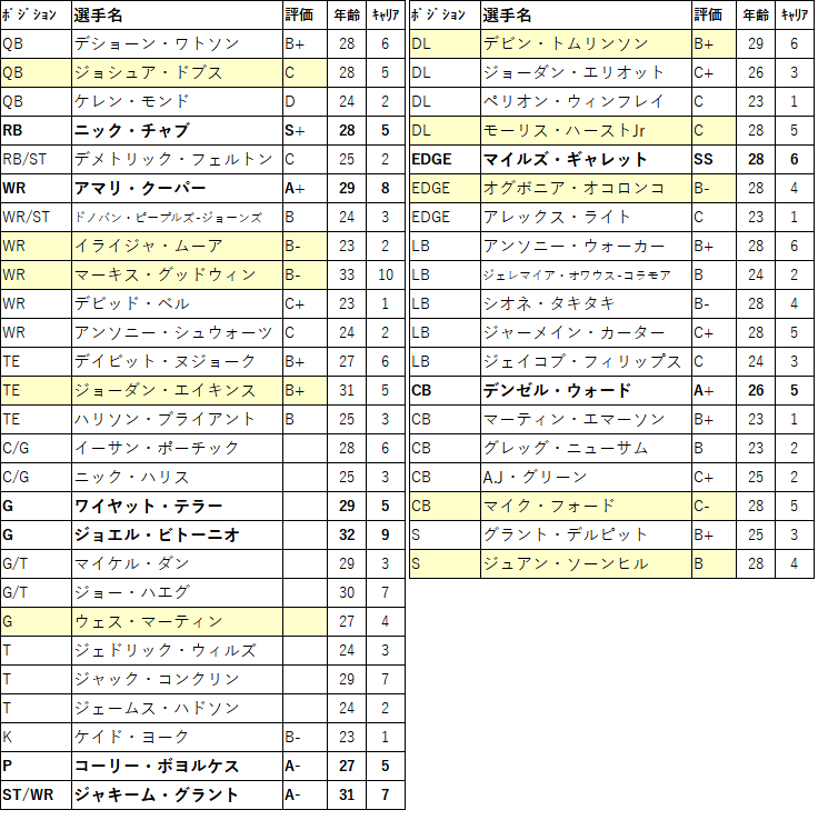 ãåœåã¯QBã©ãã»ã«ã»ãŠã£ã«ãœã³ã§è¡ãããç¡ãç¶æ ã§ãã®ã§ãä»ã®ããžã·ã§ã³ãè£åŒ·ããŠãããããRBã¯æšå¹Žãžã£ãã³ãã»ãŠã£ãªã¢ã ã¹ãè² å·é¢è±ãçãã£ããäžå¿è² å·è ãåºãå Žåã®ããã«æåã¯ããŠããããã