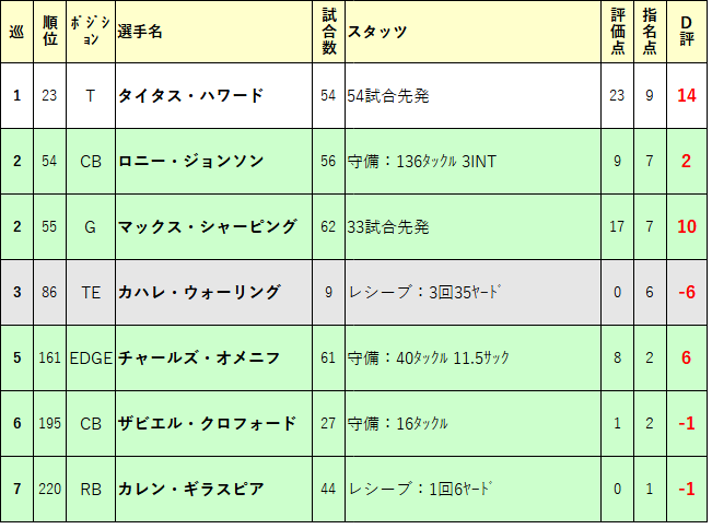 1巡目Tタイタス・ハワードは、1年目から先発RTとして出場 5年目オプションで残留となっています。大型延長をするほどのパフォーマンスとは言いにくいですが、ある程度で残ってほしい選手ですね。