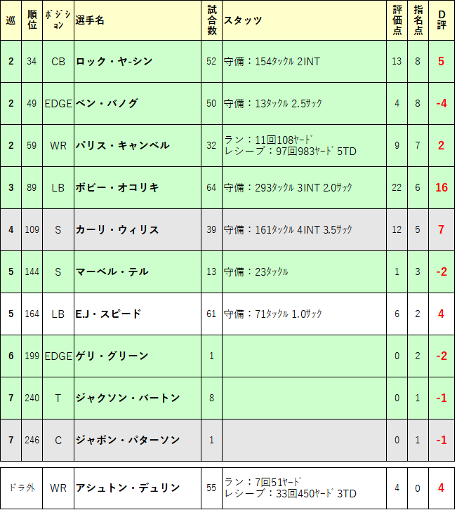 3巡目LBボビー・オコリキは、2年目までは準先発 3年目から不動の先発として2年連続130タックル以上を記録しチームの守備の要として活躍しまいした。今年はジャイアンツと4年40Mで契約となりました。ぜひ残してほしかった選手でしたが残念です。