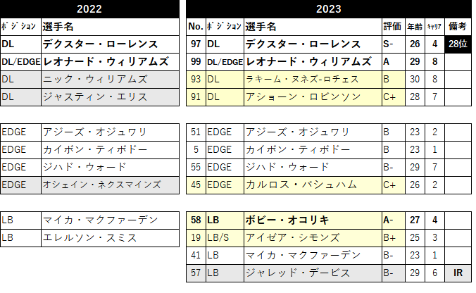 ãæšå¹Žã®åŒ±ç¹ãšèšãããLBã¯ã³ã«ããããããŒã»ãªã³ãªããç²åŸããŸããã2幎é£ç¶100ã¿ãã¯ã«è¶ ããèšé²ããã¿ãã¯ã«ãã·ãŒã³ã§ããäžå€®ã»ãµã€ã瞊暪ç¡å°œã«å®ããå®åç¯å²ã®æŸãLBã§ããè£åŒ·ã ãšæããŸããããã§ã©ã³å®åãæ¹åãããããšãæåŸ ãããã