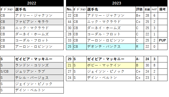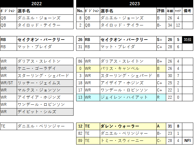 ãæ»æã®æŠåã¯ã¡ãã£ãšã¢ããããŸããããåé¡ã¯QBãããšã«ã»ãžã§ãŒã³ãºã«ãã¹ãã©ãã ã課ãã®ãã ãããè£åŒ·ãã¿ãéãã§ã¯äœæŠãšããŠã¯æšå¹Žãšå€ãããªãæãã§RBã»ã€ã¯ãªã³ã»ããŒã¯ãªãŒã®ã©ã³ã軞ãšãªãã®ããªãšããæãã«ã¯èŠããŸãã