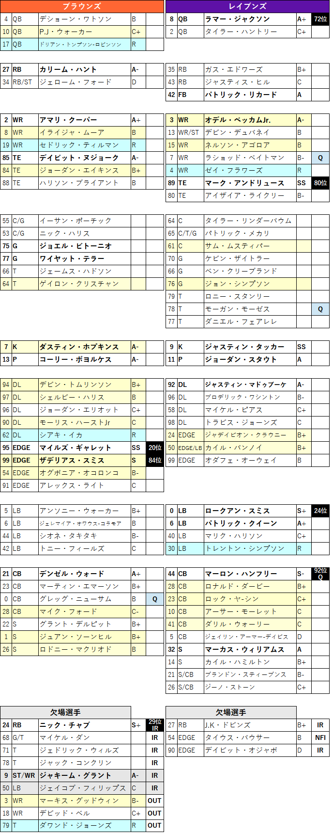 なんだろうねぇ、QBラマー・ジャクソンは今年そんなめちゃくちゃ走ってるという感じではないけど、パス成功率が71.5%ってなにさ?もっとミススローしなさいよ。なんか確かにパス精度いいんだよなぁ・・・これが困る。昔からブラウンズ戦はランじゃなくパスでやられてる印象だし、今回もなんかそうなりそうで怖い。てか前回のWeek4もパスもランもバランスよくやられたしなぁ。今回はなんとかめちゃくちゃ調子いい守備がなんとかしてくれると信じたいが。。。