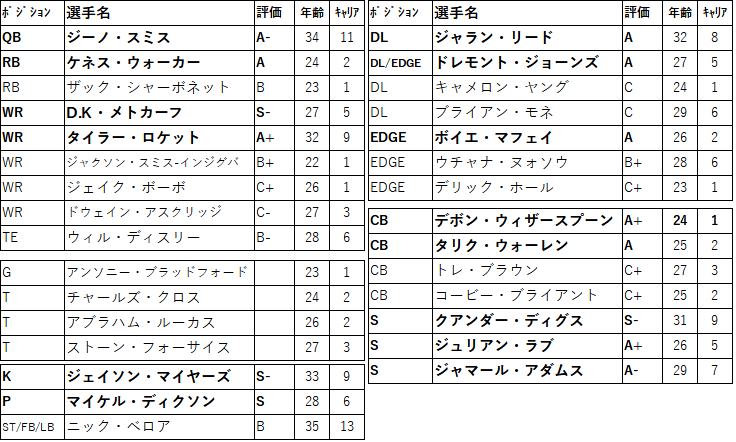 昨年トレードでとったDLレオナード・ウィリアムスも残すのは難しい。TEノア・ファントもTOP5くらいのサラリーは必要かも。となると新たなチーム作り開始初年度となるかもしれませんね。
