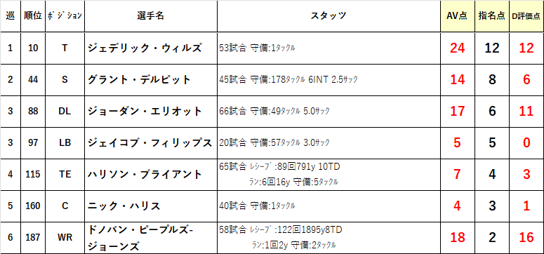 ã6å·¡ç®ã®DPJããšWRãããã³ã»ããŒãã«ãº-ãžã§ãŒã³ãºã¯1幎ç®ãã2çªæWRãšããŠãQBãã€ã«ãŒã»ã¡ã€ãã£ãŒã«ãæä»£ã®äž»åã¬ã·ãŒããŒã§ããããã ã¡ã€ãã£ãŒã«ããããªããªããšåºçªããªããªããæšå¹Žéäžã§ã©ã€ãªã³ãºãžç§»ç±ã埩掻ãæåŸ ããŠãããïŒïŒïŒ