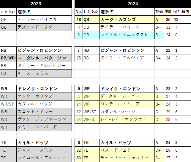 ã1å·¡ç®ã¯é©ãã®QBãã€ã±ã«ã»ãããã¯ã¹Jr.ç²åŸã§ãããä»å¹ŽQBã«ãŒã¯ã»ã«ãºã³ãºã4幎å¥çŽã§ç²åŸããããšããããQBæåã¯ãŸããªããšæãããã ãã«ããšã«ããèªåã®QBãäœããããšããããšã§ã4幎å¥çŽãªããã«ãºã³ãºãããªããžQBã«ããã€ãããªãã§ãããããæªã ã«ççžã¯è¬ã§ãã